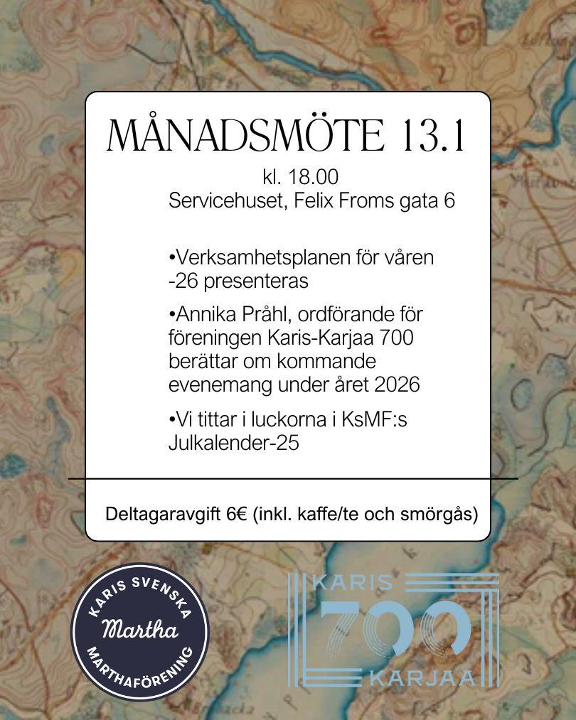 Januari månadsmöte den 13.01.2026 kl.18.00 Servicehuset, Felix Froms gata 6. Deltagaravgift 6€ (inkl. kaffe/te och smörgås)