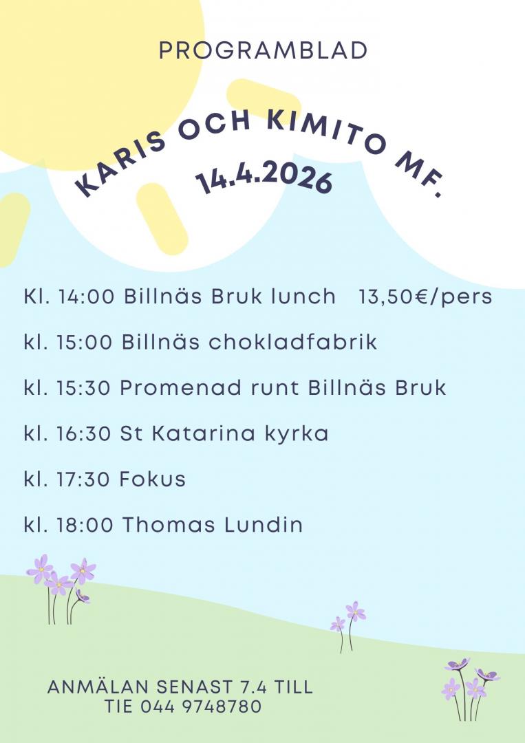 Vi besöker Billnäs Chokladfabrik, promenad i bruket. Besök till Sankta Katarina kyrka i Karis, eventuellt besök till Fokus. Kvällsprogram kl. 18 med Månadsmöte där Thomas Lundin gästar oss och presenterar sina böcker. Deltagar avgf. 6€/pers inkl. kaffe/te & smörgås.