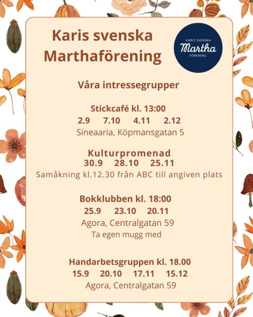 Till föreningen hör också Grundsjö marthakrets, som har sina träffar utanför föreningens program. Karis svenska Marthaförening träffas den andra tisdagen i månaden i Servicehusets café, Felix Froms gata 6. Mötet börjar kl 18.00 med info om vad som är på gång, och ca 18.30 fortsätter vi med "program". Därutöver har föreningen intressegrupper som träffas en gång per månad: stickcafé dagtid, kulturpromenad dagtid, bokklubb kvällstid och en handarbetsgrupp kvällstid. Vi annonserar  i tidningen EU under rubriken "Tapahtumat", FaceBook, Instagram och Karis svenska Marthaförenings hemsida om aktuella händelser. Följ annonseringen